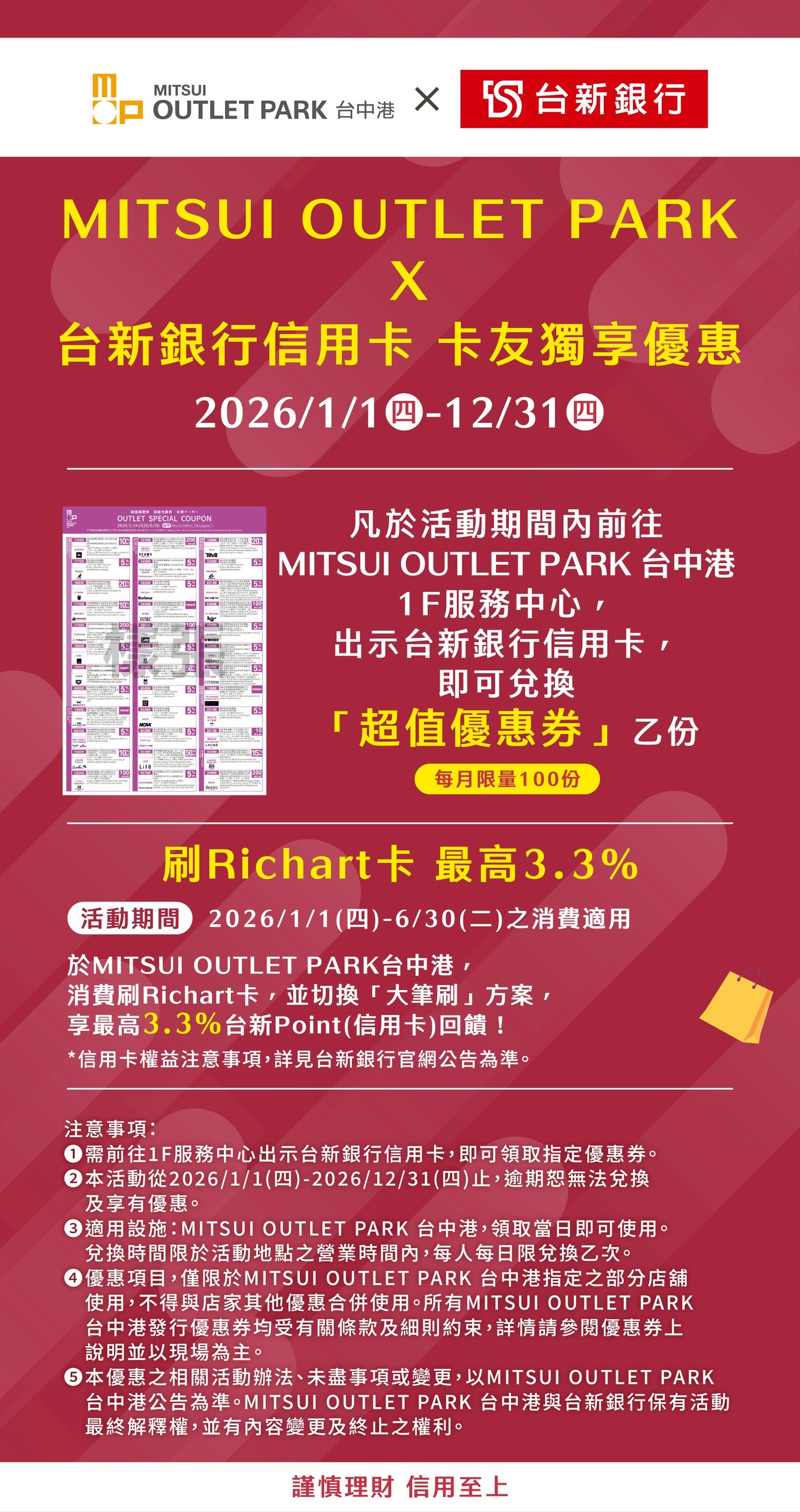 MITSUI OUTLET PARK 台中港 × 台新銀行卡友獨享優惠