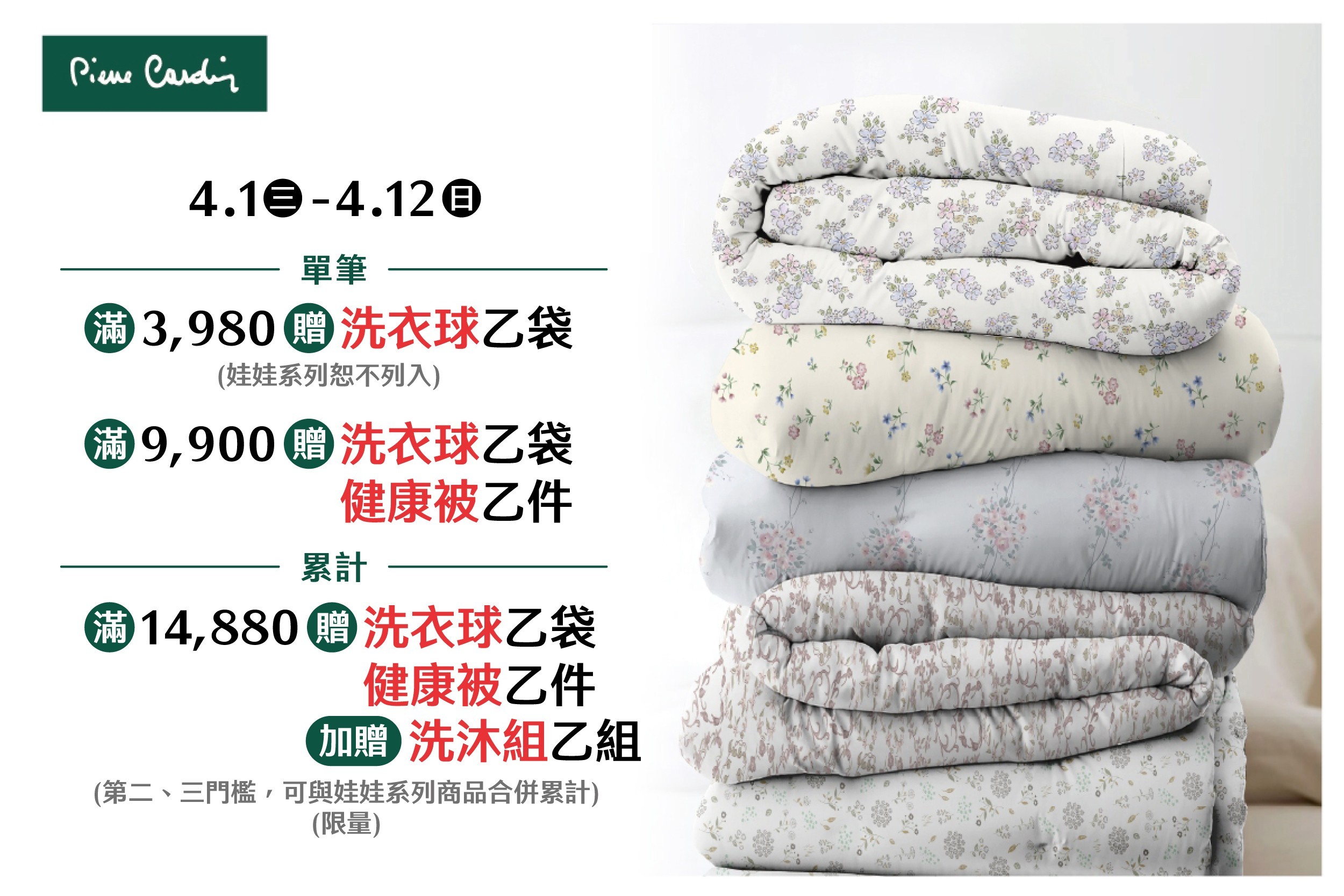 ●累計滿14,880加贈洗衣球 乙袋 + 健康被 乙件 + 洗沐組 乙組
