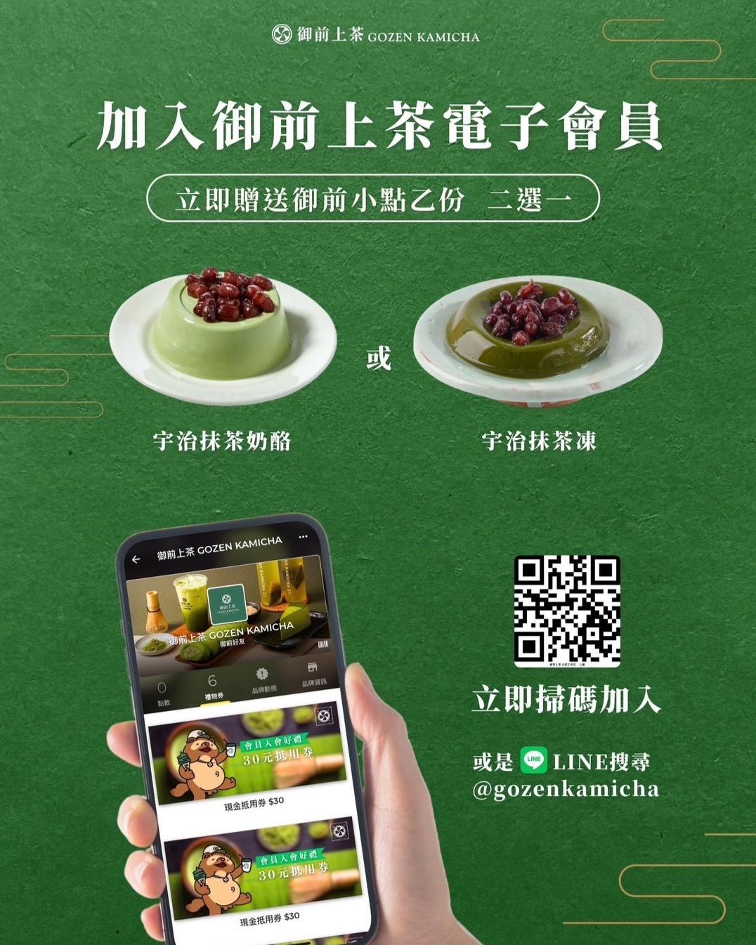 當日加入御前上茶電子會員立即贈送御前上茶小點乙份(宇治抹茶奶酪 or宇治抹茶凍,二選一)