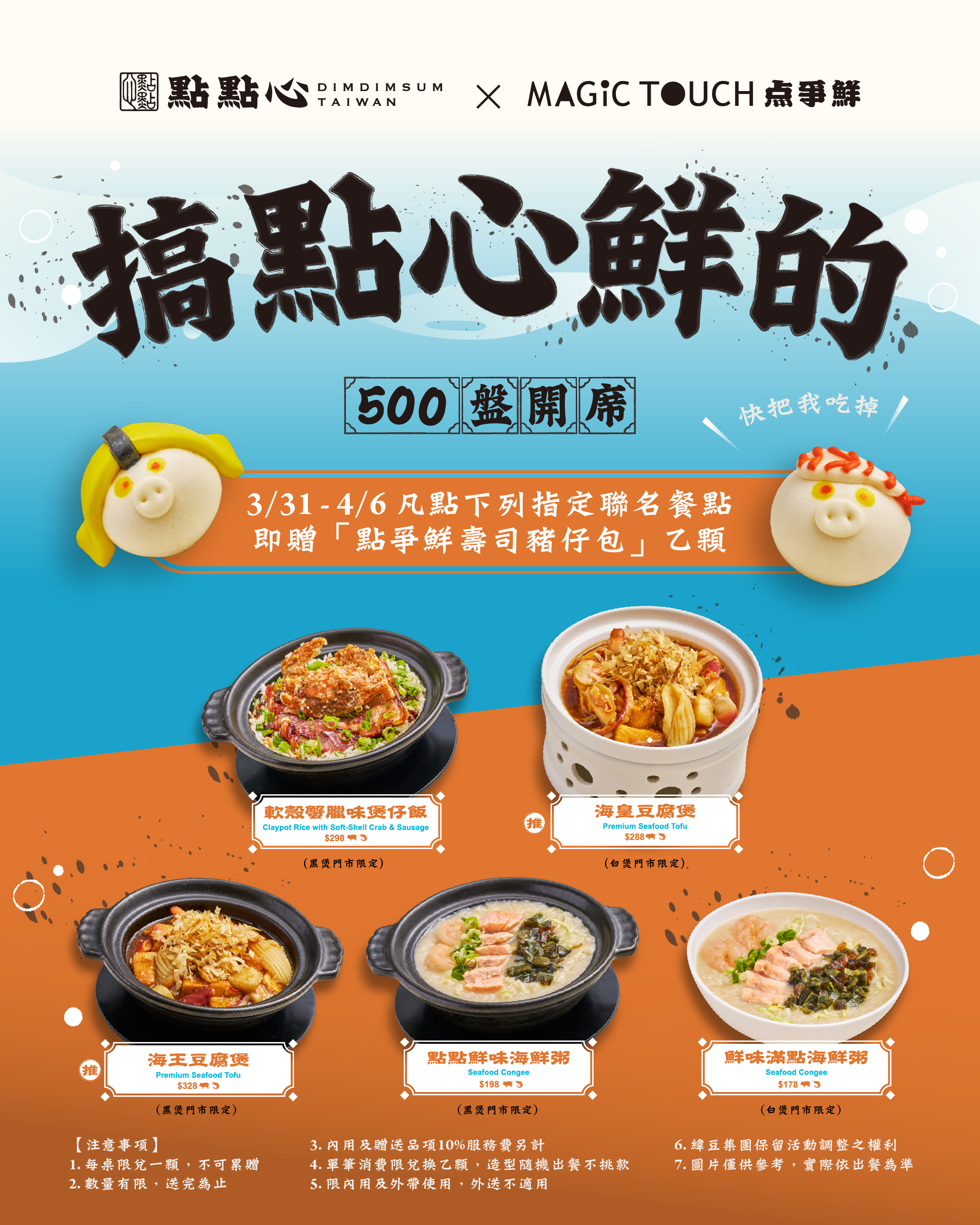任點軟殼蟹臘味煲仔飯、點點鮮味海鮮粥、海王豆腐煲贈「點爭鮮壽司豬仔包乙顆(造型隨機)」