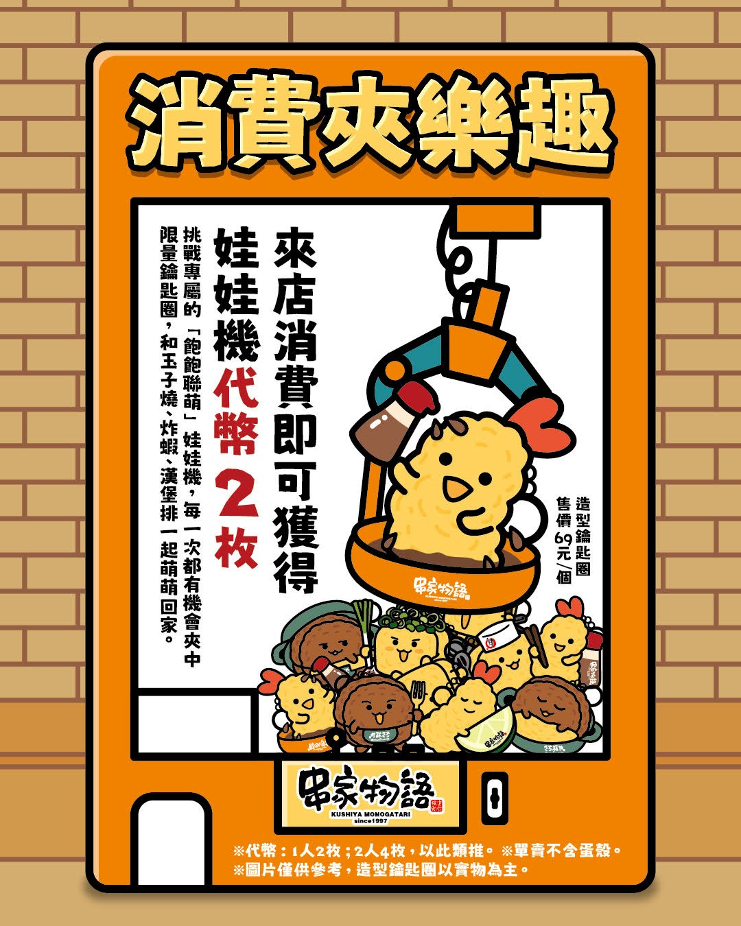 來店消費,每人即可獲得娃娃機代幣2枚