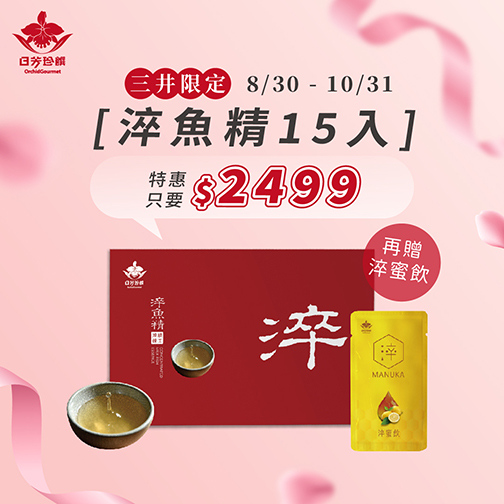 2025-08-20 府城市集 日芳珍饌OUTLET獨家活動 府城市集 日芳珍饌OUTLET獨家活動 活動時間:8/29(五)~10/31(五) 府城市集X日芳珍饌淬魚精15入 OUTLET獨家價$2499(原價$3000),加碼再贈【淬蜜飲】 ※活動組數數量有限,售完為止 美食&食品 1F