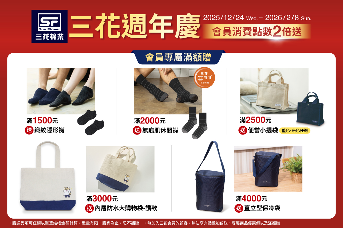 單筆滿1500元送織紋隱形襪,單筆滿2000元送無痕肌休閒襪,單筆滿2500元送便當小提袋
