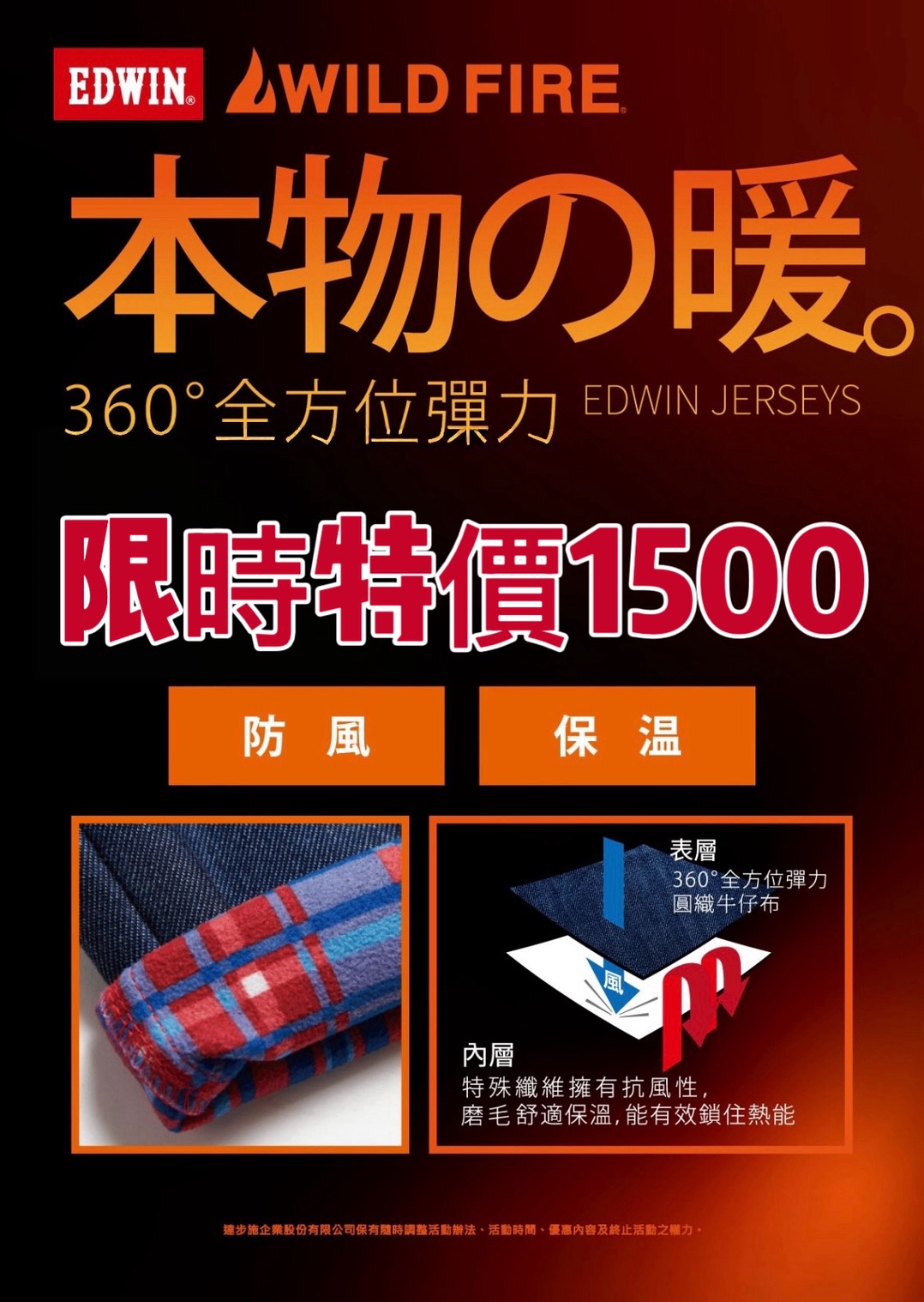 2025-11-25 Edwin 指定商品限時優惠價 Edwin 指定商品限時優惠價 活動時間:即日起~11/30(日) 指定外套、牛仔長褲限時特價1500元,滿6600元再折600元。 男/女裝 3F