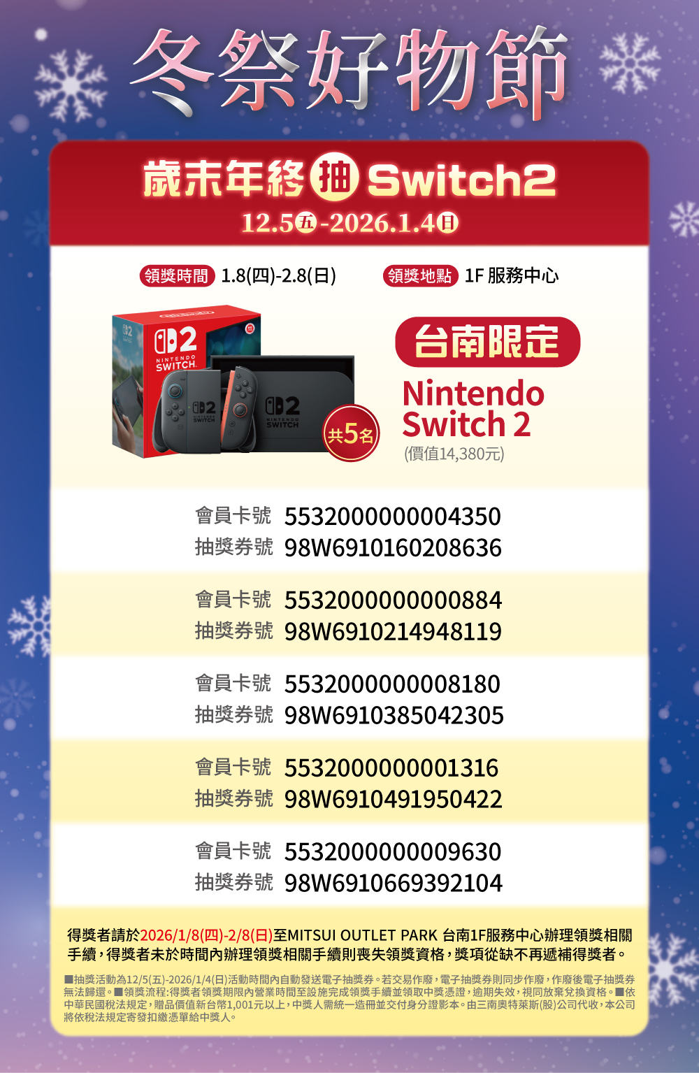 【冬祭好物節】歲末年終抽Switch2 中獎公告