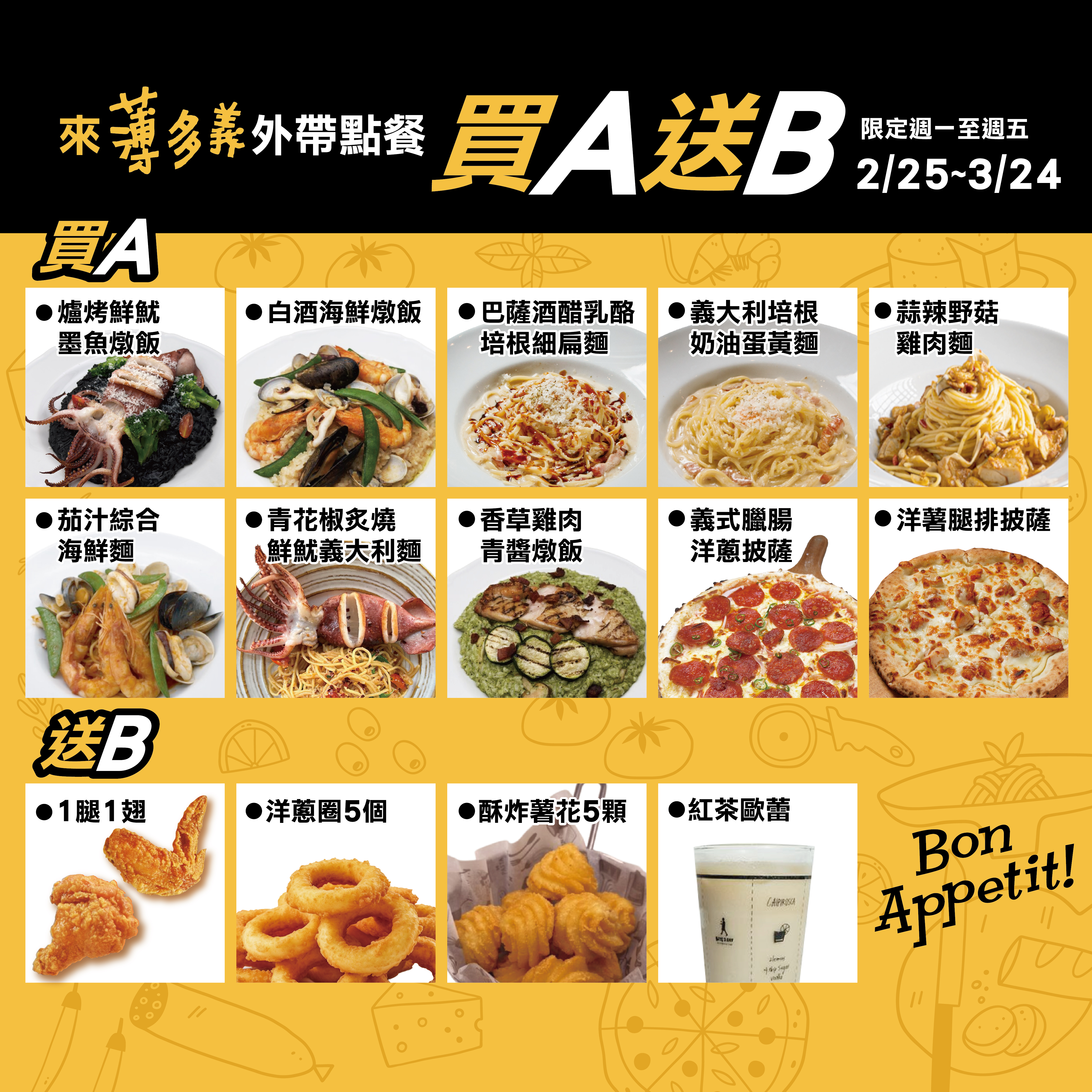 2026-03-09 薄多義 平日外帶買A送B 薄多義 平日外帶買A送B ■ 活動日期:即日起-3/24(二) 週一至週五 外帶限定 點一份A區主餐,送B區小點心/飲品四選一 美食&食品 2F 主題餐廳
