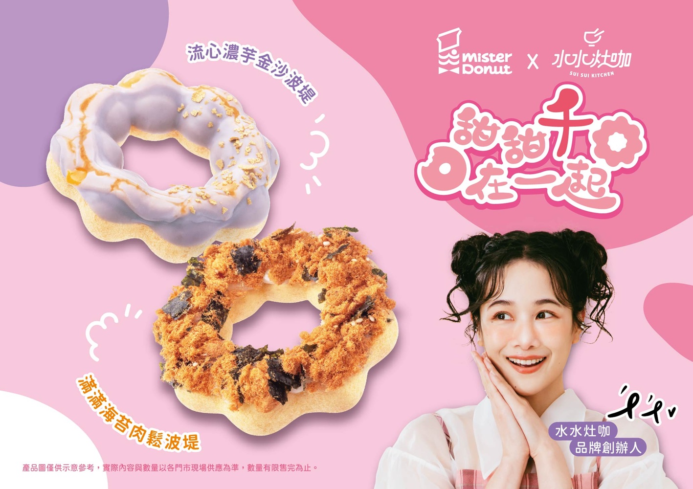 Mister Donut x水水灶咖夢幻獻禮~Mister Donut攜手百萬創作者『千千』的自創品牌-『水水灶咖』共同開發8款聯名商品,結合備受喜愛的台、泰特色風味元素,將甜甜圈翻玩出混血新創意,帶給粉絲們與以往不同的甜甜圈新體驗。1月6日起,與粉絲們甜甜「千」在一起!